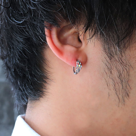 フープピアス 彫り ユリ 百合 ピアス メンズ 中折れ式 フープ 手彫り 片耳 キャッチレス 10金 18金 プラチナ シルバー 洋彫り (品番 mp-0170-b-m)