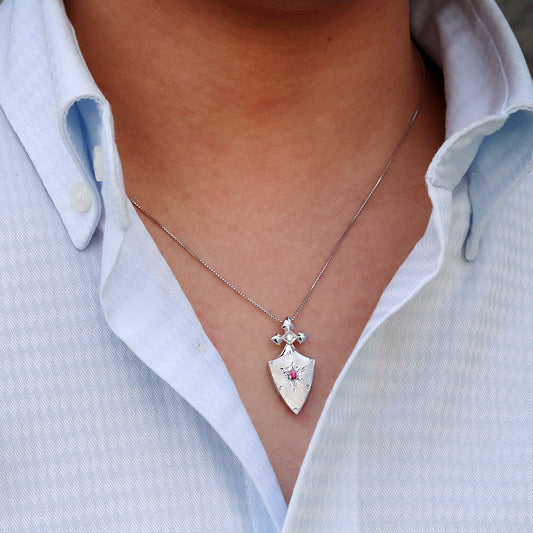 希少石 メンズ ペンダント アレキサンドライト シールド 彫金 10金 18金 プラチナ シルバー 盾 十字架 ネックレス カッコイイ (品番 mh-0407-alex-m)